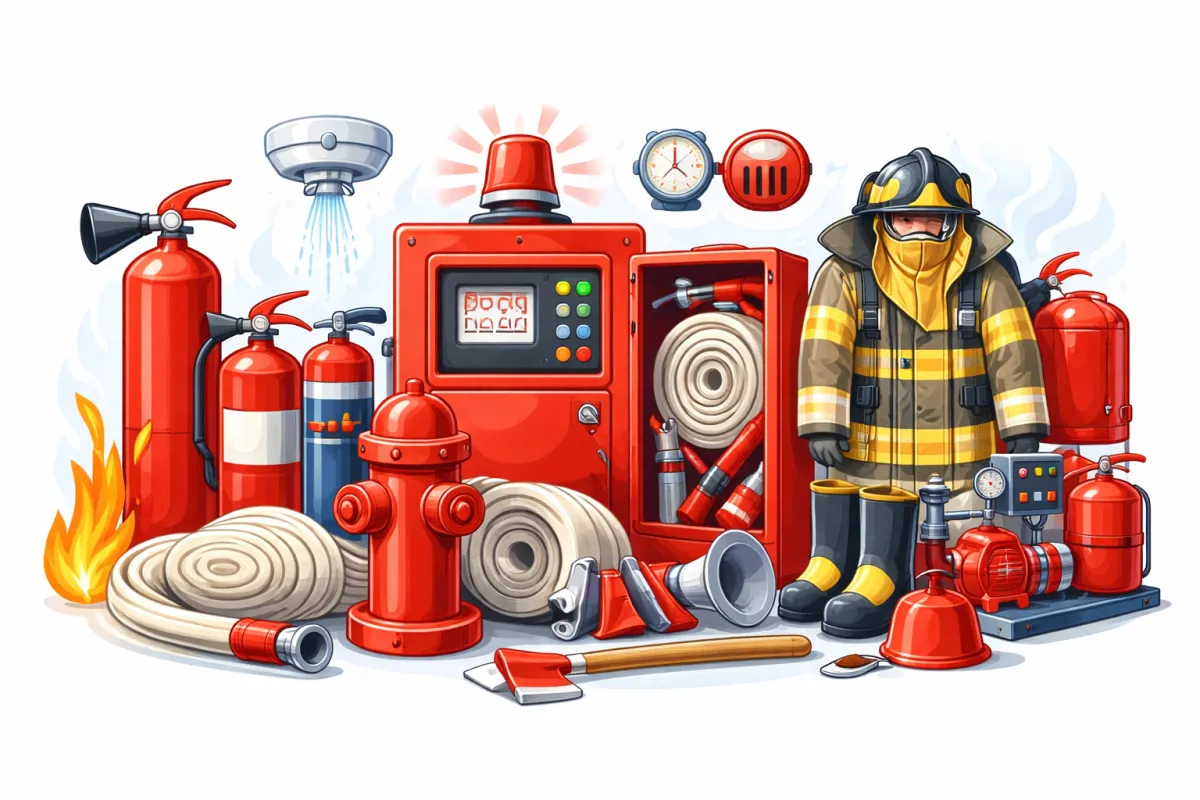 - Пожарное оборудование (рукава, стволы, гидранты, шкафы, клапаны).