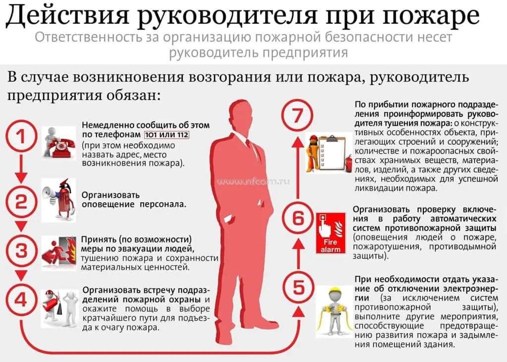 - известить о пожаре руководителя организации или заменяющего его работника.