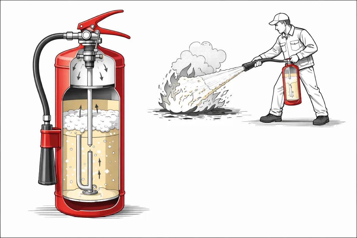 Принцип образования пены основан на физическом смешивании: водный раствор под давлением выталкивается из баллона и проходит через специальную насадку, где соединяется с воздухом. Проходя через сетку насадки, жидкость захватывает воздух и на выходе образует воздушно-механическую пену низкой или средней кратности. Она получается достаточно плотной и тяжелой, чтобы не сдуваться сквозняками и надежно накрывать очаг, формируя стойкую изолирующую массу.