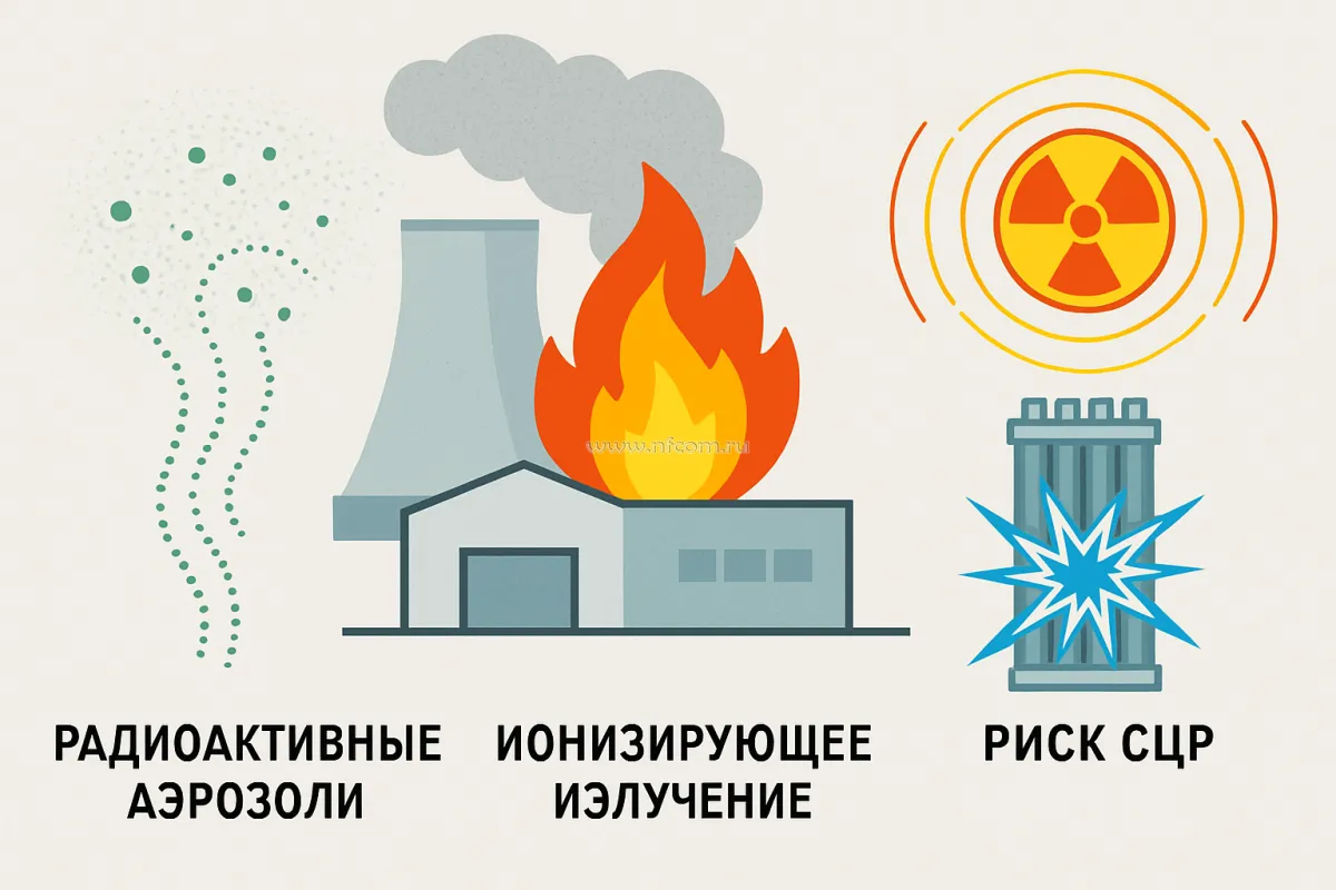 - Рост радиационного фона: Разрушение защиты приводит к резкому и неконтролируемому росту ионизирующего излучения в зоне пожара.