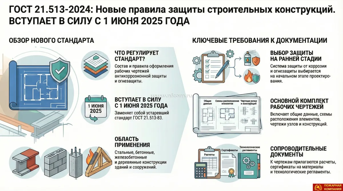 ГОСТ 21.513—2024 устанавливает правила выполнения и оформления рабочей документации (рабочих чертежей) для антикоррозионной защиты и огнезащиты конструкций зданий и сооружений различного назначения. Он является частью Системы проектной документации для строительства (СПДС).