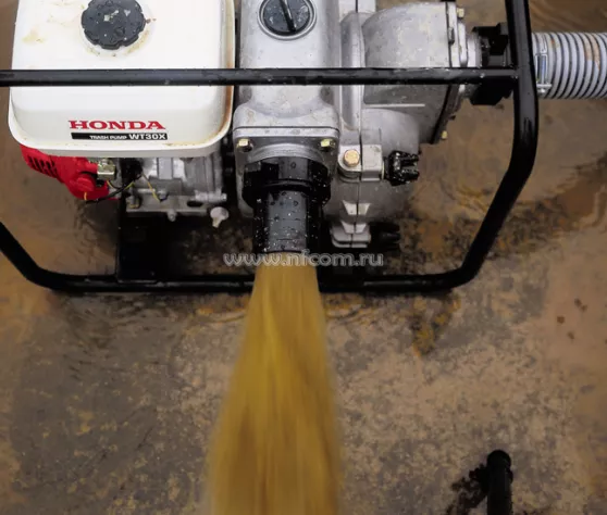 Мотопомпа HONDA WT-30X. Модель, разработана для перекачки грязной, заиленной воды при интенсивной эксплуатации в экстремальных условиях. Имеет производительность 1300 литров в минуту и высоту подъёма до30 метров. Мотопомпа способна перекачивать частицы размером до 30 мм. Крепкий защитный каркас, большая мощность двигателя и двойной корпус насоса делают устройство особо прочным и надежным. Насос предназначен для профессионального использования.
