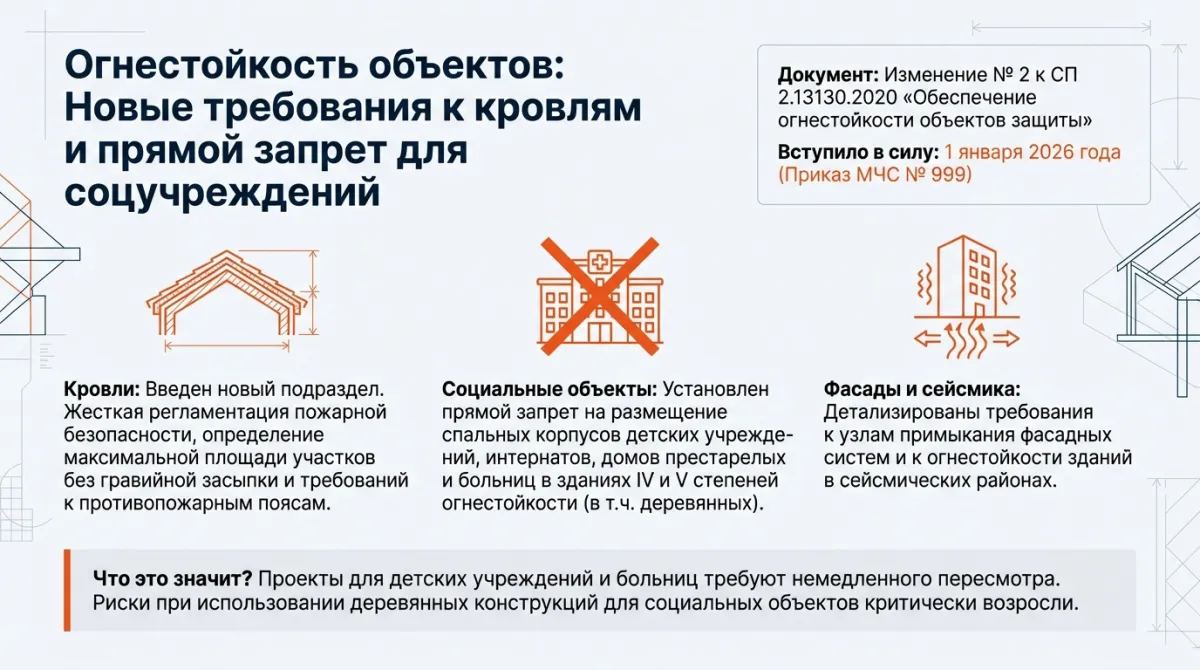 Требования к огнестойкости (новые нормы для кровель и запрет на деревянные корпуса для соцобъектов) | Приказ МЧС России № 999 (Изм. № 2 к СП 2.13130.2020) | 01.01.2026 |