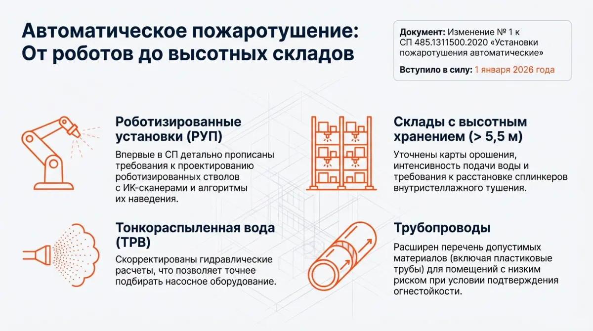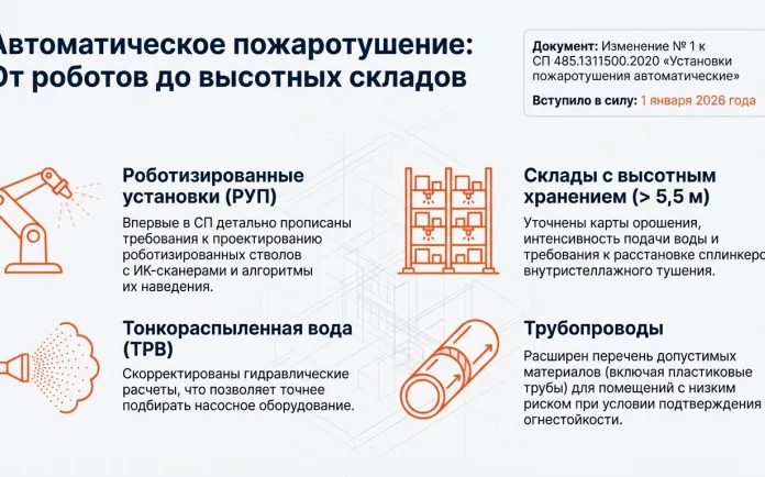 - Впервые в СП детально прописаны требования к проектированию роботизированных стволов, которые находят очаг возгорания с помощью ИК-сканеров.