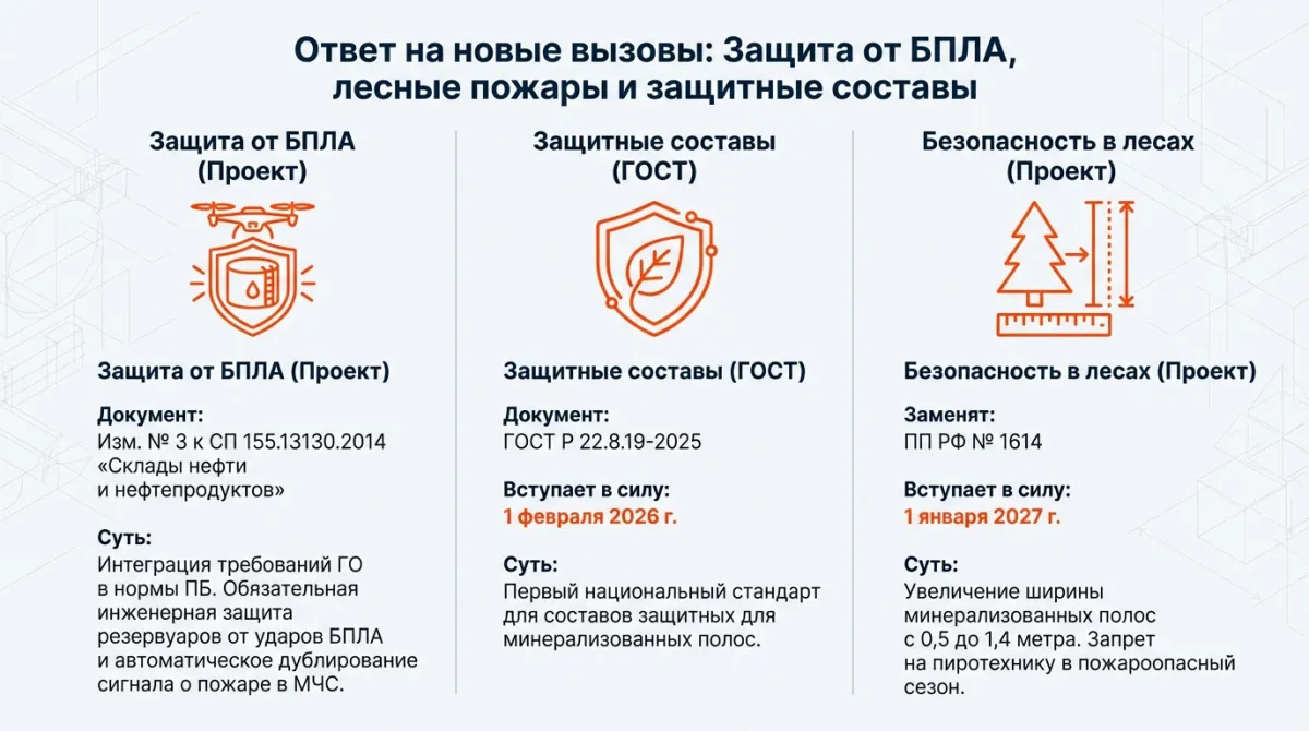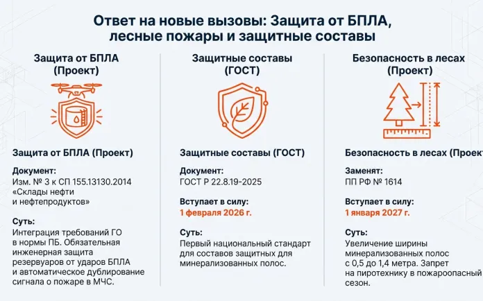 Суть: Интеграция требований гражданской обороны в нормы пожарной безопасности. Обязательная инженерная защита резервуаров от ударов БПЛА и автоматическое дублирование сигнала о пожаре в подразделения МЧС без участия человека.