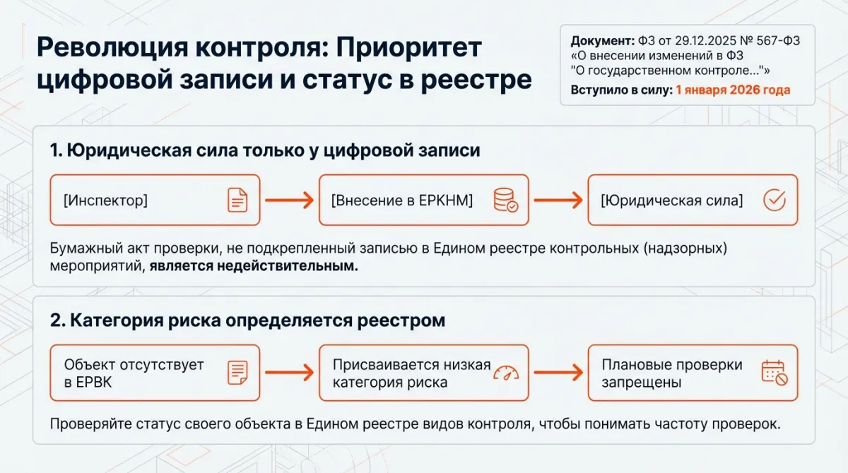 Цифровой надзор (приоритет записи в ЕРКНМ, юридическая сила только у цифровых актов) | Федеральный закон № 567-ФЗ (изменения в ФЗ-248) | 01.01.2026 |