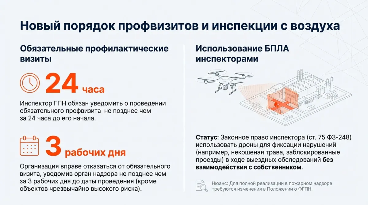 Статус: Разрешено законом (ст. 75 ФЗ-248). Инспекторы получили законное право использовать дроны для фиксации нарушений (например, некошеная трава, заблокированные проезды) в ходе выездных обследований без взаимодействия с собственником. (однако для реализации такой возможности в пожарном надзоре сначала необходимо дождаться изменений в Положении о ФГПН)