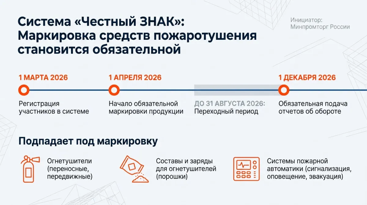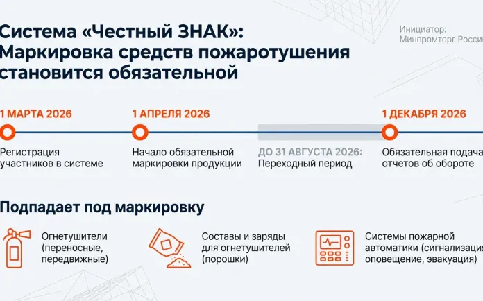 Маркировка средств пожаротушения (начало обязательной маркировки огнетушителей и составов) | 01.04.2026 | |