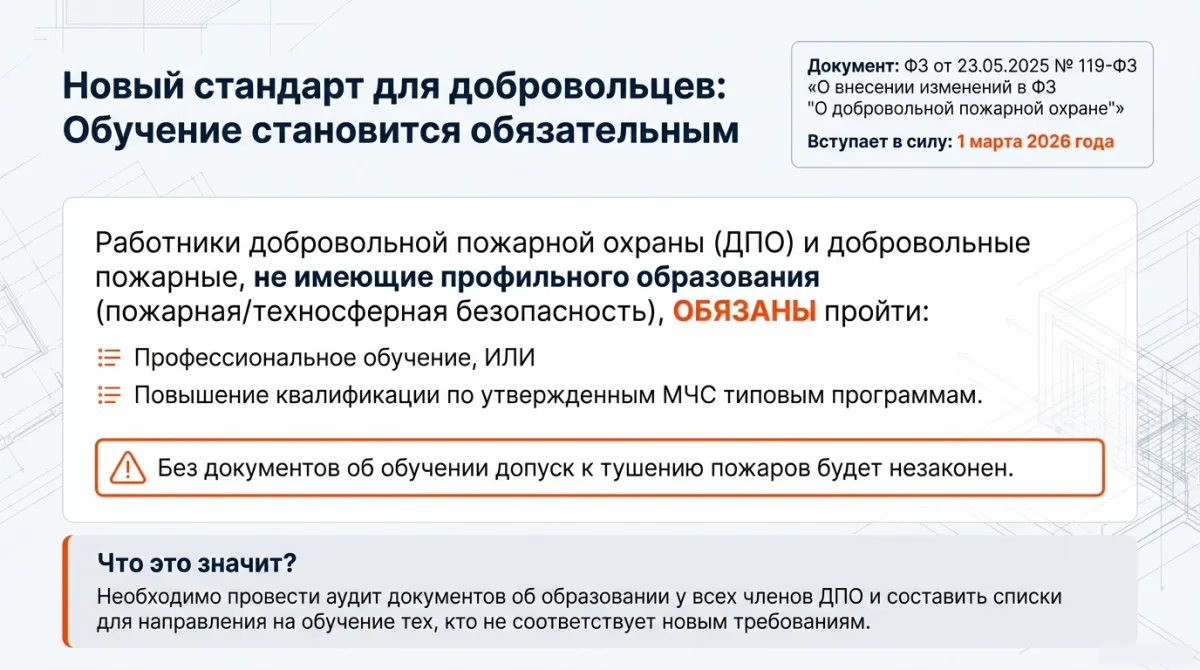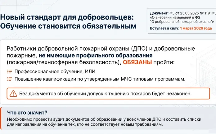 Суть требования: Работники добровольной пожарной охраны и добровольные пожарные, не имеющие профильного образования (пожарная безопасность, техносферная безопасность), обязаны пройти: