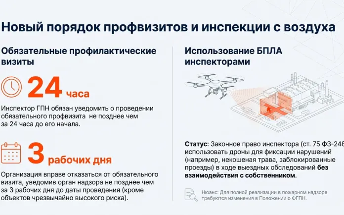- Срок уведомления: Инспектор ГПН обязан уведомить контролируемое лицо о проведении обязательного профилактического визита не позднее чем за 24 часа до его начала. Ранее точный срок в законе отсутствовал, что приводило к внезапным визитам.