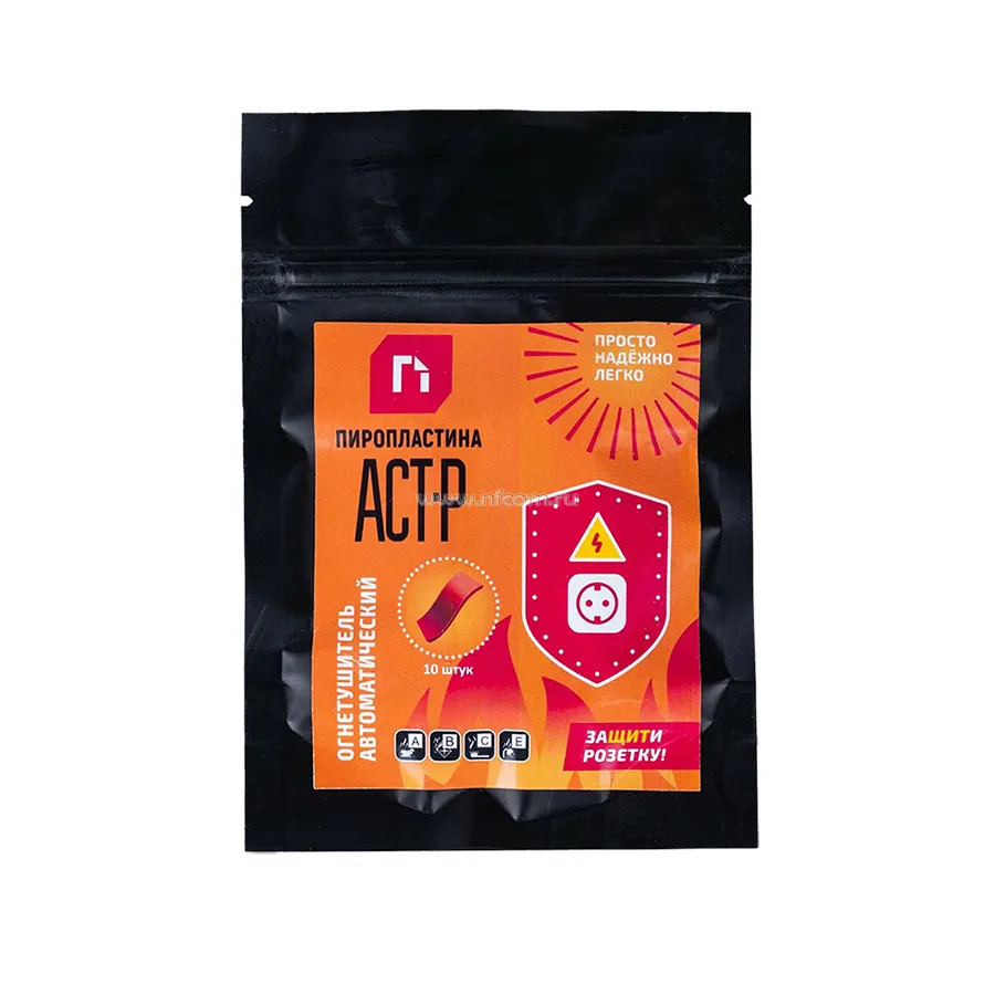 Автономная установка пожаротушения ПироПластина АСТ-Р предназначена для защиты электрических розеток от возгораний. Защищаемый объем 0,5 литров. Пластина размещается внутри защищаемой розетки, в том месте, где есть возможность перегрева, короткого замыкания или искрения.