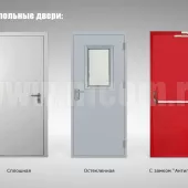 Конструкция противопожарной двери — состоит из коробки (рама+наличники) и полотна. Рама изготавливается из стального листа, согнутого в сложный профиль. По периметру, внутренняя полость профиля в районе притвора заполнена теплозвукоизоляционным материалом. Рама является жесткой конструкцией и одновременно образует наличник. На раму навешивается полотно двери противопожарной при помощи регулируемых петель. Полотно глухой противопожарной двери имеет коробчатую конструкцию и состоит из стального листа толщиной 1,5 мм. Внутренняя полость полотна заполнена теплоизоляционными материалами. Толщина слоев теплоизоляционных материалов и порядок их следования зависит от предела огнестойкости двери противопожарной (EI 60 или EI 30). Предел огнестойкости определяет время, в течение которого дверь способна защищать от распространения огня и дыма во время пожара. Предел огнестойкости EI 30 (30 минут). Предел огнестойкости EI 60 (60 минут). По периметру дверной коробки устанавливается термоуплотнительная лента, заполняющая зазоры между полотном и коробкой. Уплотнители - резиновый от холодного дыма и терморасширяющийся от горячего.
