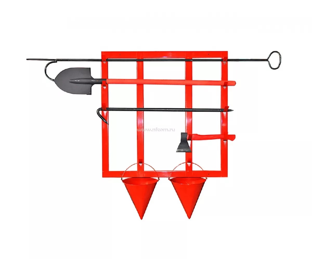 Пожарный щит, комплектация по требованиям ГОСТ : лом, багор, лопата, два конусных ведра. По желанию заказчика добавляются: топор, огнетушители, кошма (противопожарное полотно).